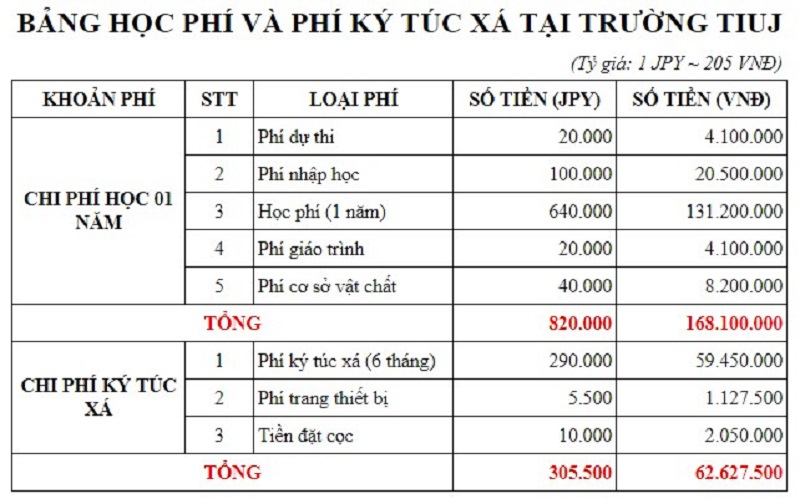 Về chi tiết học phí và phí ký túc xá tại trường Nhật ngữ TIUJ bạn có thể theo dõi chi tiết trong bảng dưới đây: